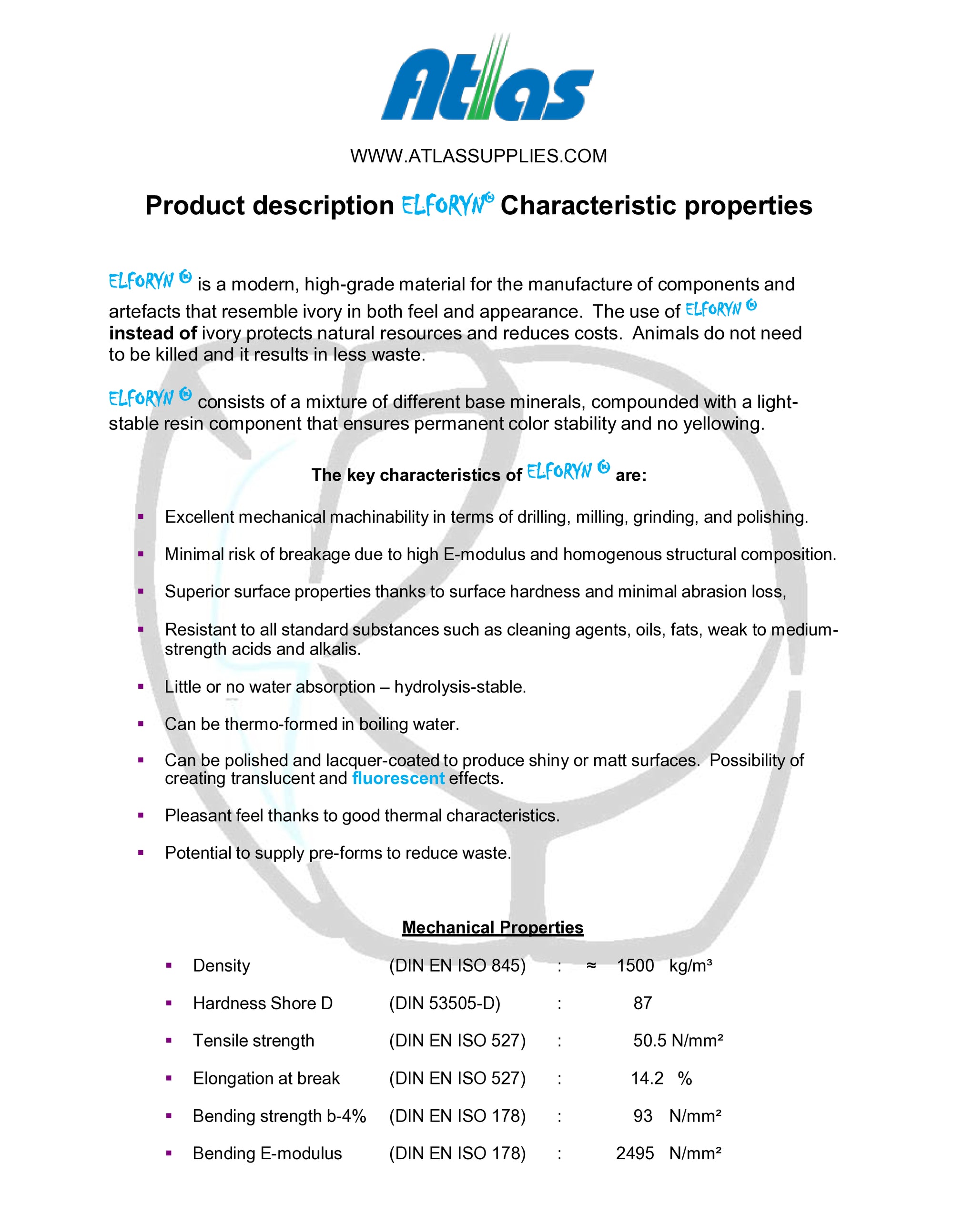Elforyn is a high-grade ivory substitute material with high mineral content. It can be processed like natural ivory - carved, turned, milled, etc. It glues well with Cyanoacrylate & Epoxy glues and can take a clear coat finish. Elforyn is chalk-resistant, thermo-formable, chips while machining, and can be polished to a beautiful luster if desired.