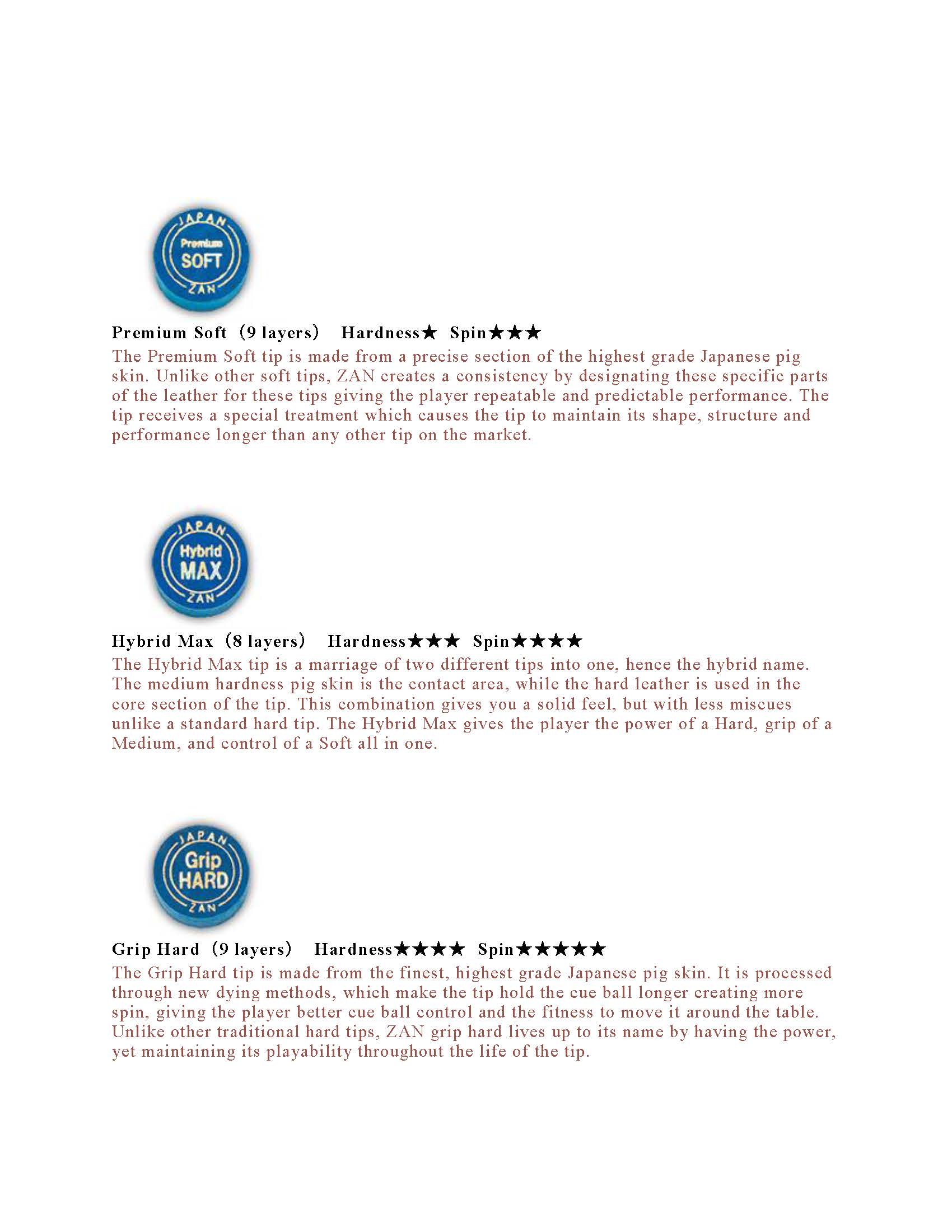 - By using the ZAN hard cue tips, the player can move the cue ball more effortlessly with a solid contact to the cue ball yet with maintaining the ability to create maximum spin.